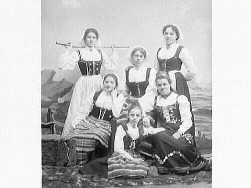 Sex personer iklädda olika folkdräkter, troligen personal och bekanta till fotografen. Sittande till höger är kollegan Elof Ernwald, övriga är flickor.