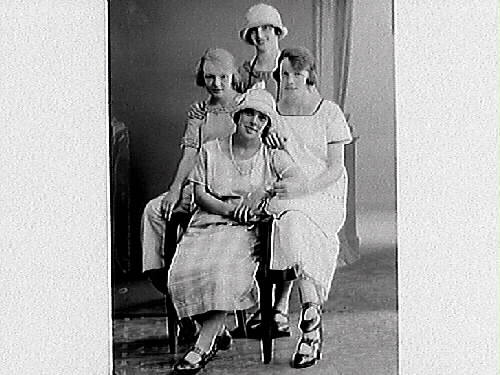 Ateljéporträtt av fyra unga kvinnor som förmodligen arbetade på Kungefors spinneri i Skene, Marks kn. Rut Andersson, som beställde bilden, är sannolikt en av kvinnorna.