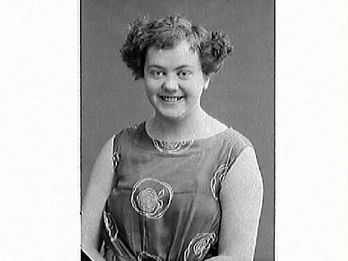 Ateljéporträtt av ung kvinna vid namn Astrid i modern frisyr och stormönstrad klänning.