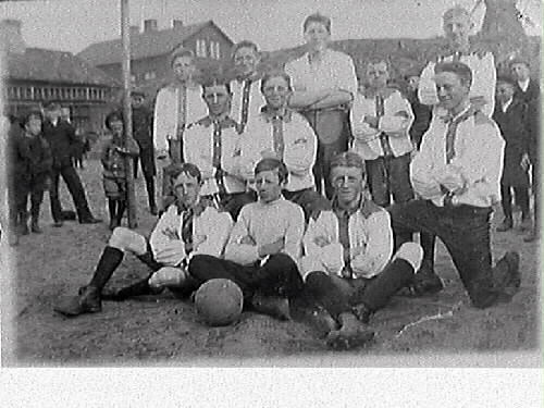 Varbergs Gifs juniorlag poserar på stadens första fotbollsplats som låg väster om kvarteret Lilla Kari. Bakom laget står barn, ett par byggnader skymtar till vänster och på höjden står en väderkvarn. Övre raden från vänster: Erik Johansson, Sten Lindberg, Albert Dahlenborg, Julius Bengtsson, Kruse Johansson. Mellersta raden: Karl Lindberg, Birger Johansson, Julius Stålbåge. Nedre raden: Karl Thorleif, Alfred Hammarkvist, L. Dahlöf.