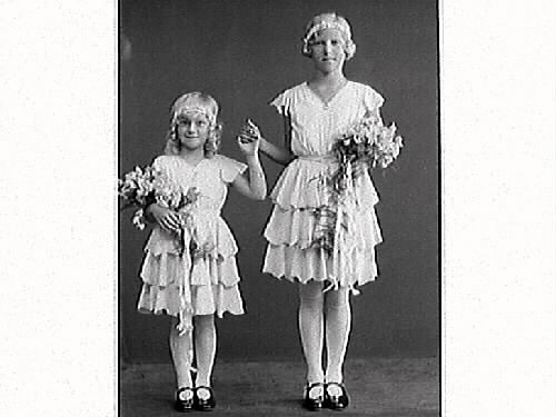 Syskonbild av två flickor i sommarskrud med blomdiadem, volangkjolar och blombuketter. Kamrer Bramstång beställde bilderna, sannolikt barnens far.