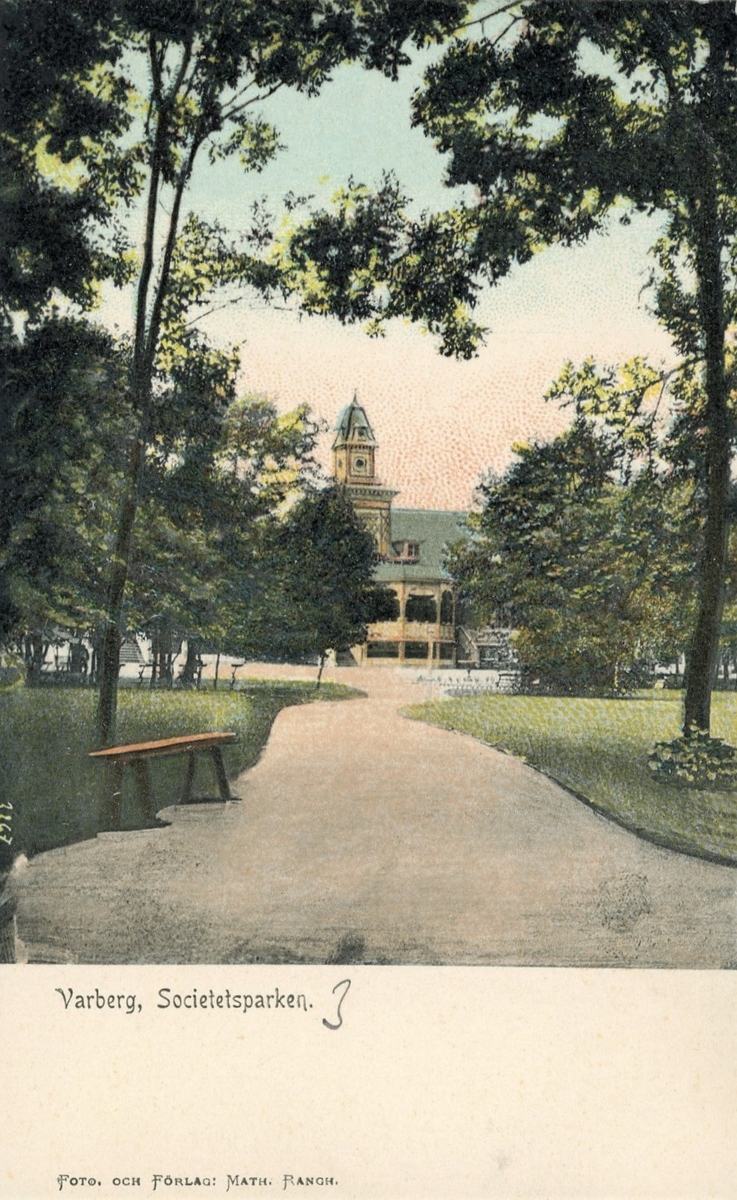 Kolorerat vykort, "Varberg, Societetsparken" med Societetsrestaurangen, i fonden av en promenadväg.