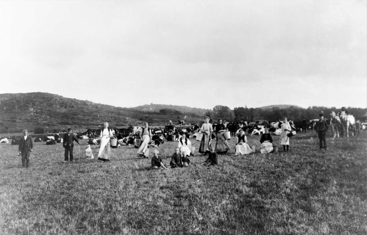 Mjölkerskor på Torstorps gård står uppställda med sina mjölkhinkar ute bland kossorna i beteshagen. Fyra barn sitter i förgrunden och några män finns också i bild. Till höger står ett par förspända hästar med kusk och vagn.