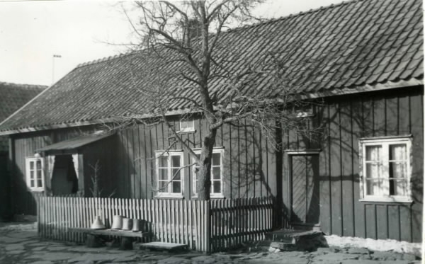 Bostadshuset tillhörigt Rybörs, Skällåkra 2:1, Värö. Mellan de två ingångarna har en yta ingärdats med trästaket där ett träd står och troligen fler växter som man vill skydda från höns och andra lösgående gjur. Gårdsytan är stenlagd.
