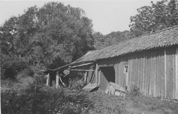 Ekonomibyggnad/uthus med portlider och ett skärmtak i Guntofta, Släp. Till höger står en kärra. Vägen fram till portlidret ser något igenväxt ut.