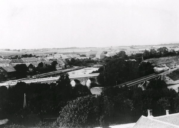 Vy över Falkenberg med järnvägen från 1886 i förgrunden och den gamla stenbron i bildens mitt.