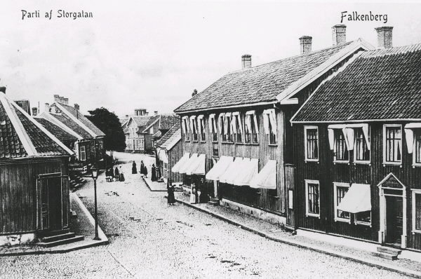 Vykort, "Parti af Storgatan. Falkenberg". Trähusbebyggelse längs gatan, där kvinnor och barn befinner sig. Markiserna är utfällda på ena husets bottenvåning.
