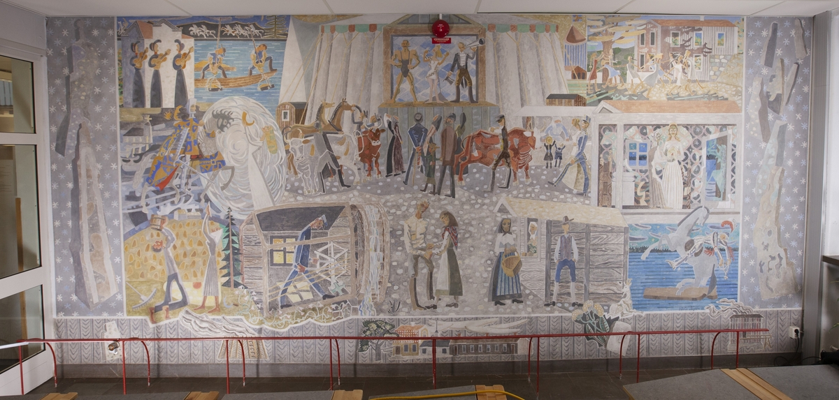Väggmålning på Enehagens skola i Värnamo, efter konservering.