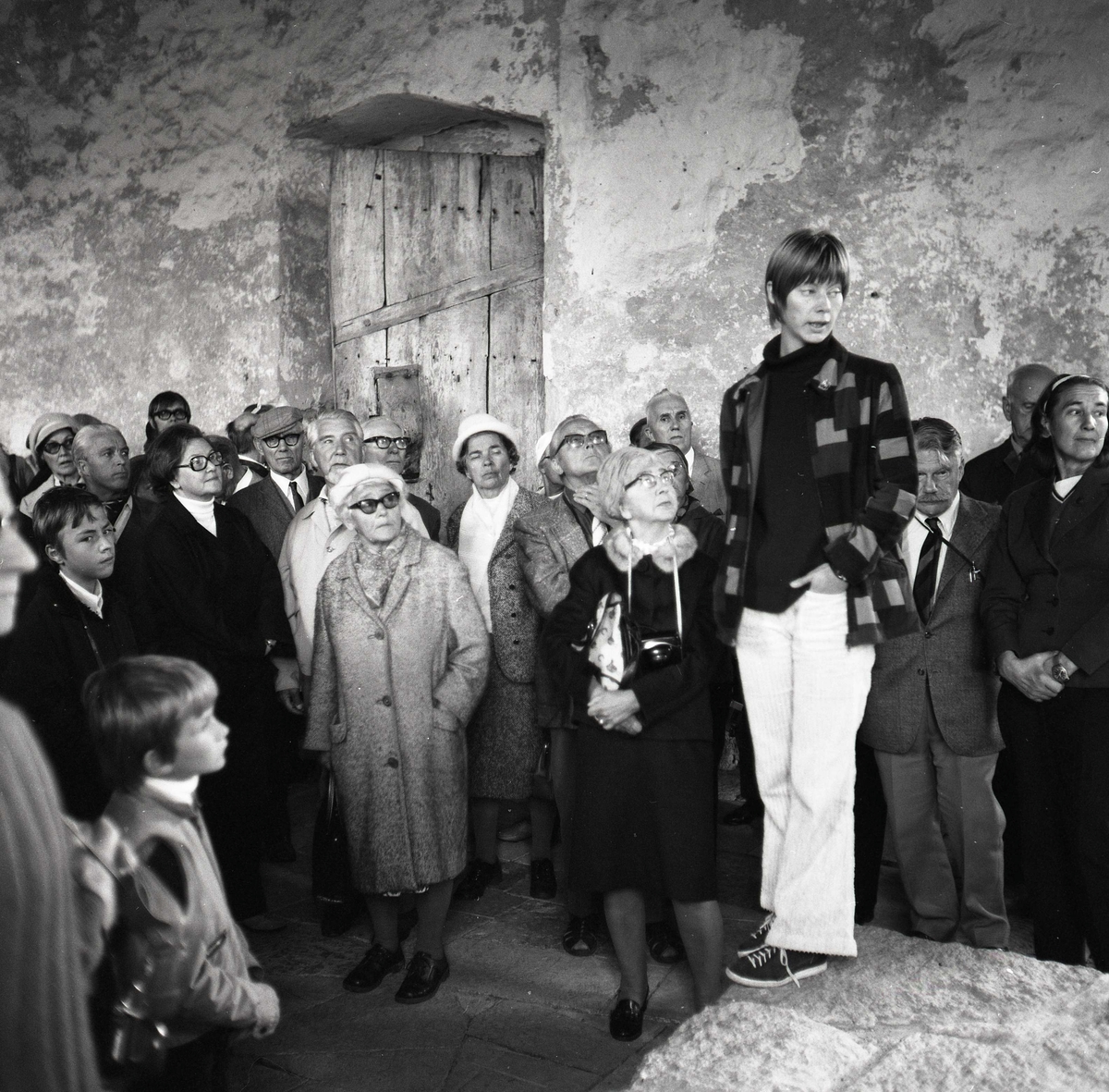 Ingegärd Edling informerar om Källa gamla kyrka inför Kalmar läns fornminnesförenings utflykt på Öland 23/9 1972.