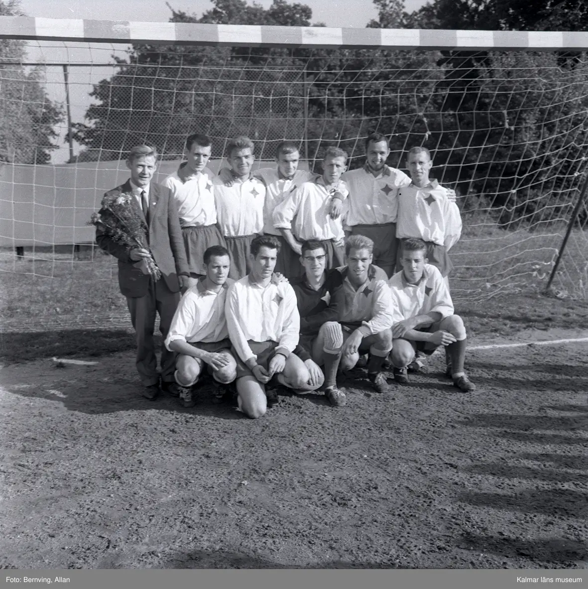 IFK Borgholm A-lag -62. Seger mot Trekanten 2-1. Gruppfoto framför fotbollsmålet.