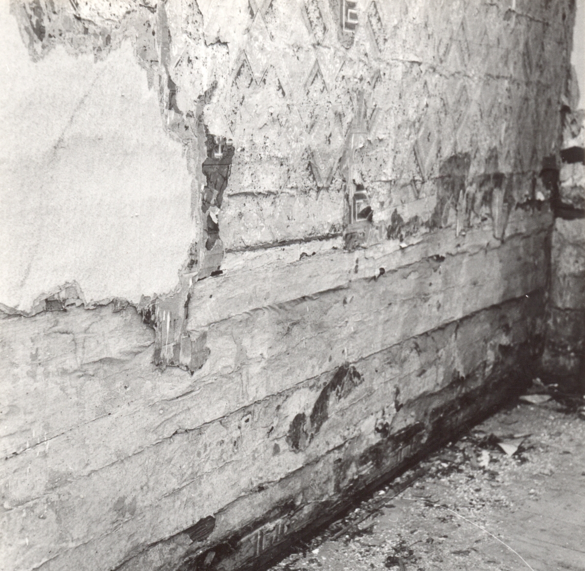 Kv Magistern 12. Stänkmålning under tapeterna: grå med svarta och röda stänk.
