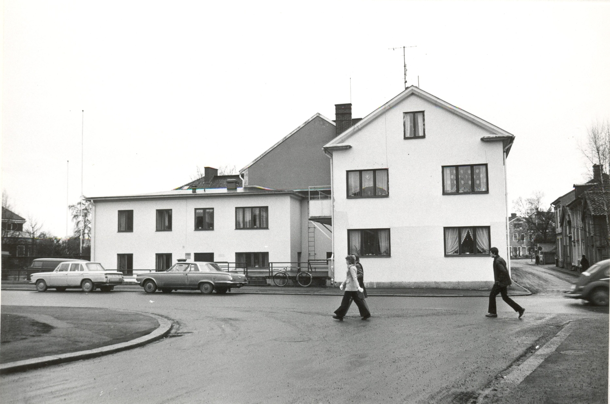 Trädgårdsgatan 3, till höger Strandgatan. Bostadshus, folk och bilar i Kalmar.