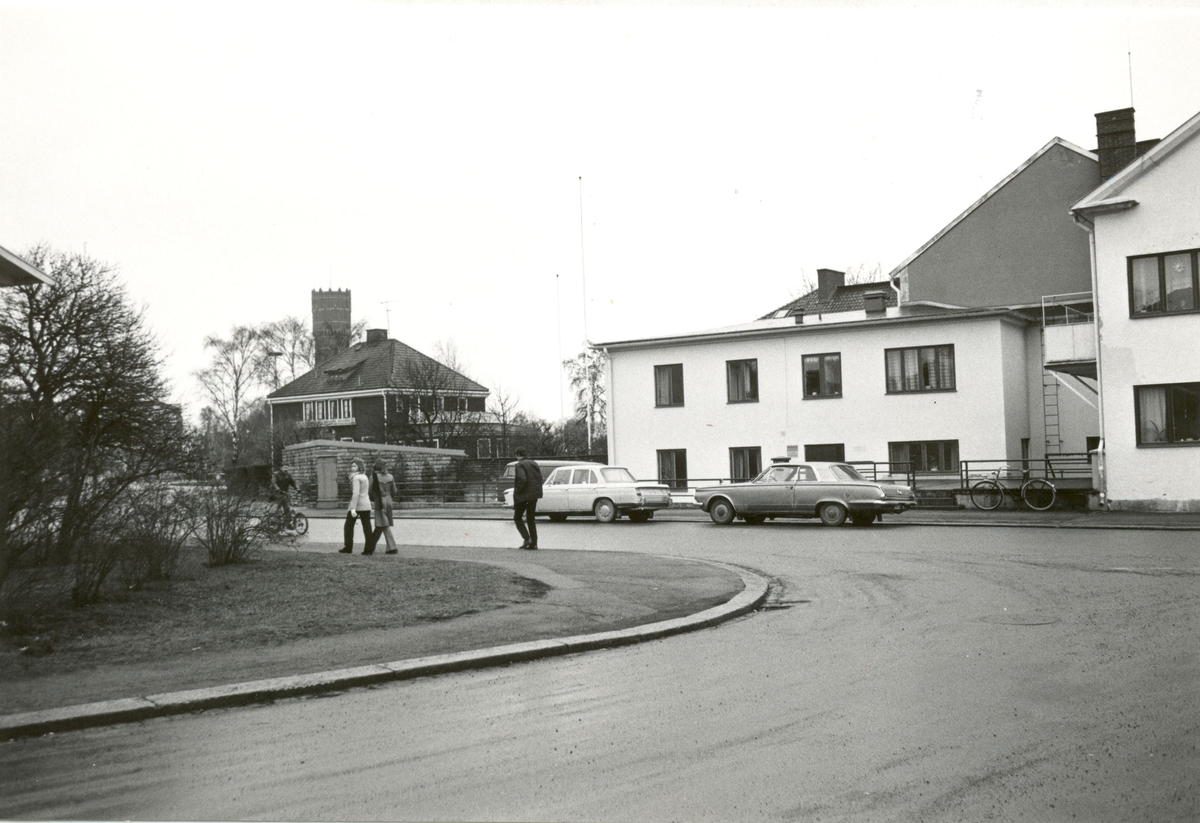 Trädgårdsgatan 1-3, till höger Strandgatan. Bostadshus, folk och bilar.
