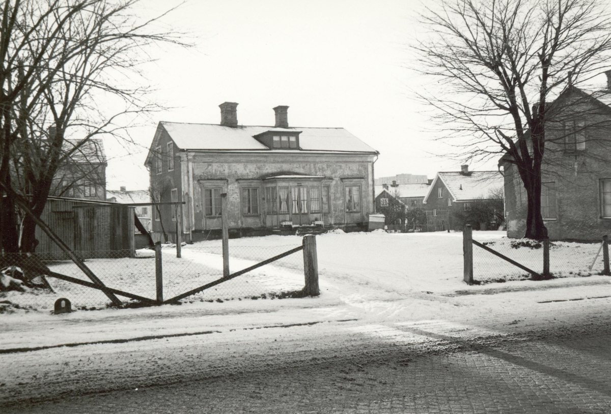 Bostadshus och staket i vinterlandskap från Södra vägen.
