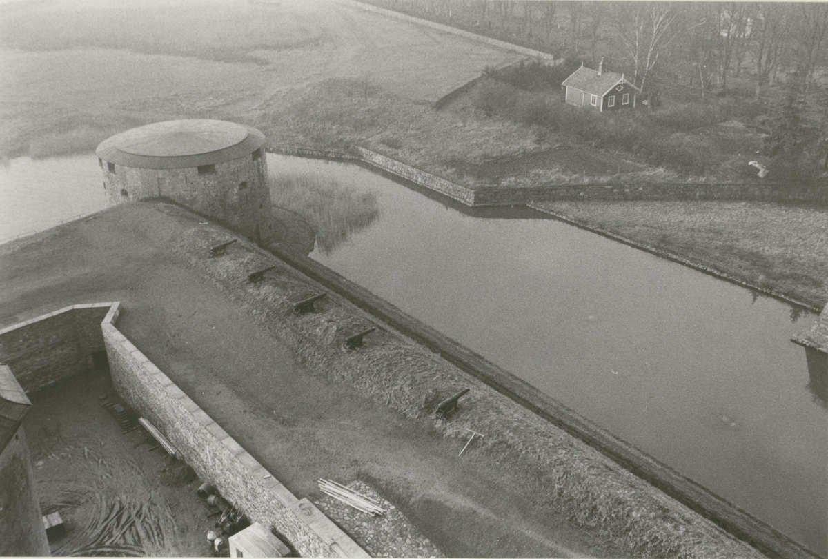 Södra delen av västra vallen med västra postejen. Överst till höger en del av kyrkogården. Från Kuretornets lanternin.
