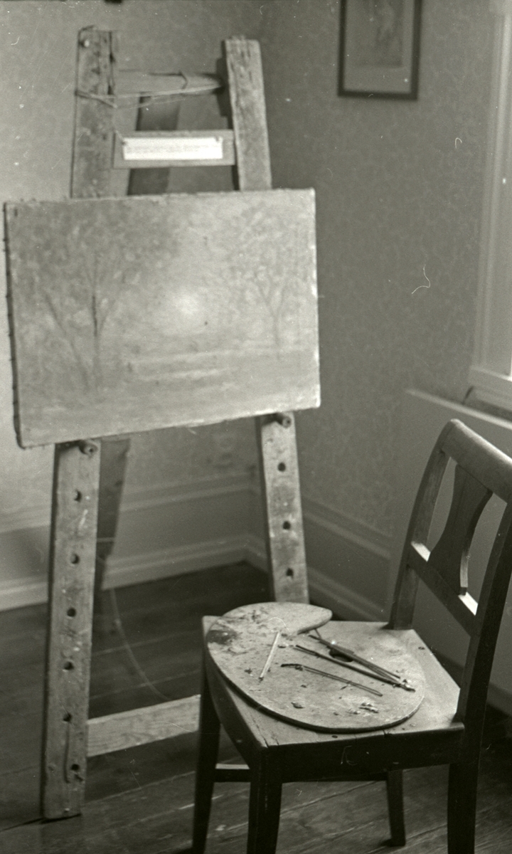 Solmålaren Per Ekströms staffli och ofullbordade sista målning.