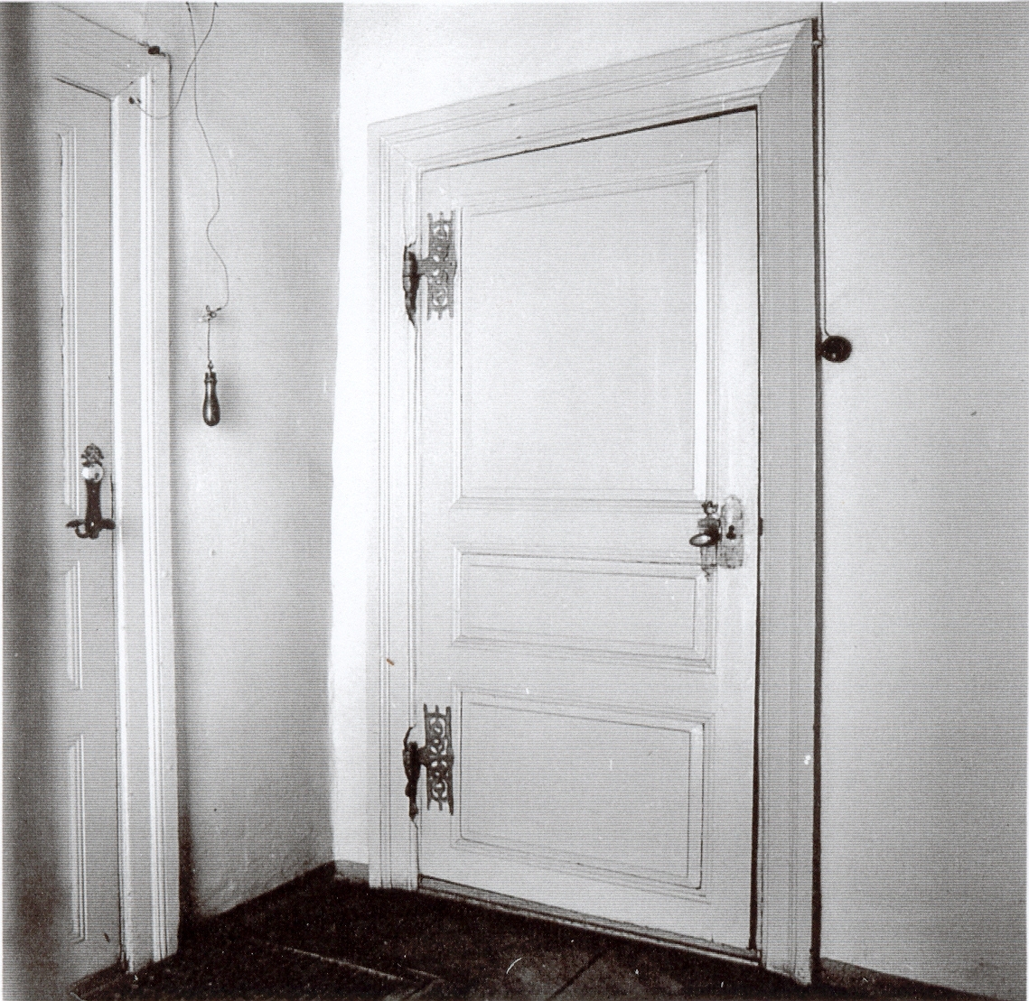 En dörr i nedre förstugan i en fastighet på kvarteret Gästgivaren.