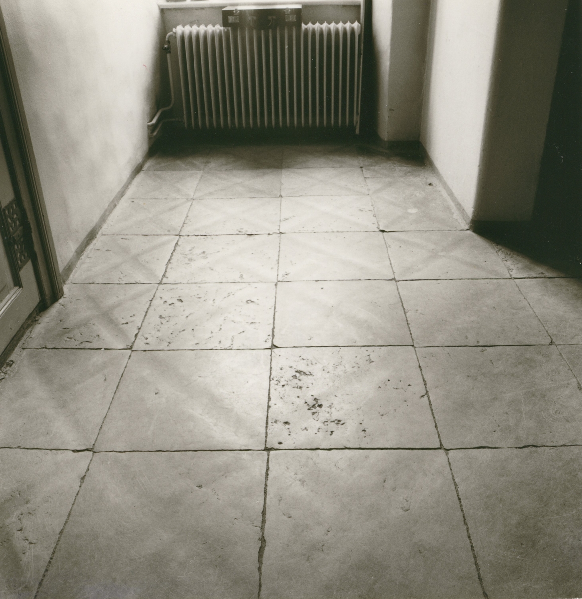 Kritat stengolv i nedre förstugan i en fastighet på kvarteret Gästgivaren.