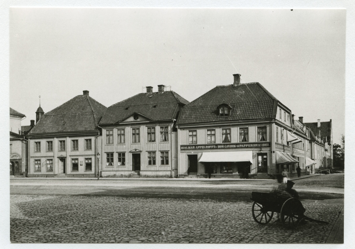 Vy från Stortorget mot kv. Rådmannen. Appeltoffts bokhandel med markis.