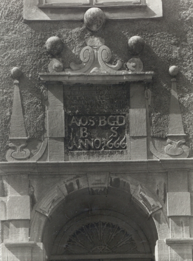 Överstycket till portalen på Dahmska huset med byggherren, Anders Olofsson Berghs och hans hustrus, Brita Gudmundsdotter Skuthe, initialer.
