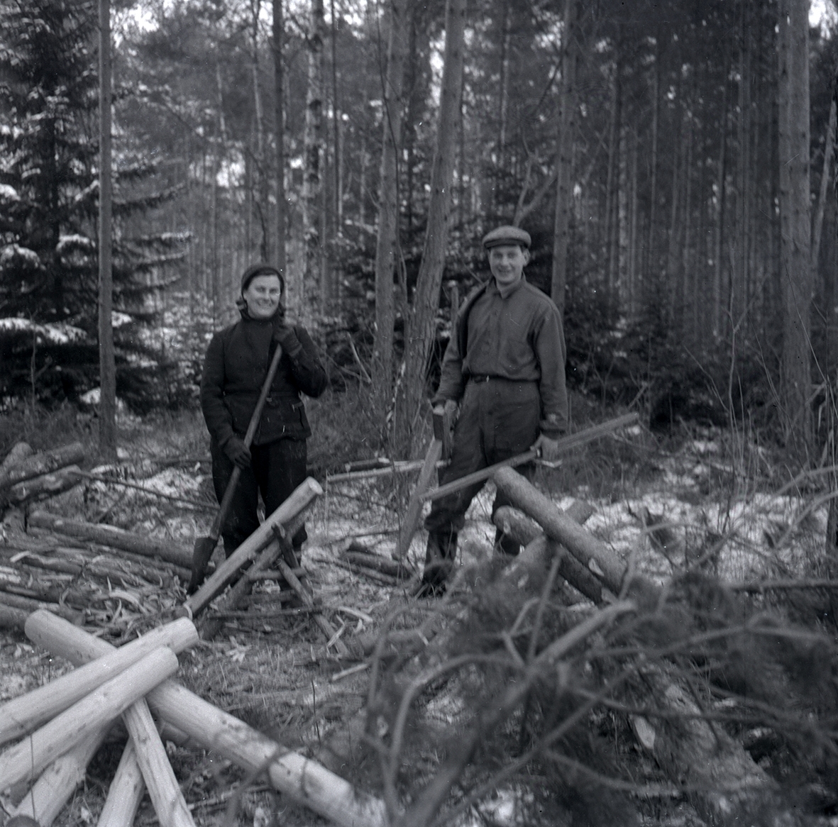 Två okända som arbetar med skog vid Björkerum i Karl Olsgården. Huset ligger numera i Himmelsberga, Långlöts socken, men låg ursprungligen i Dyestad, Runstens socken.