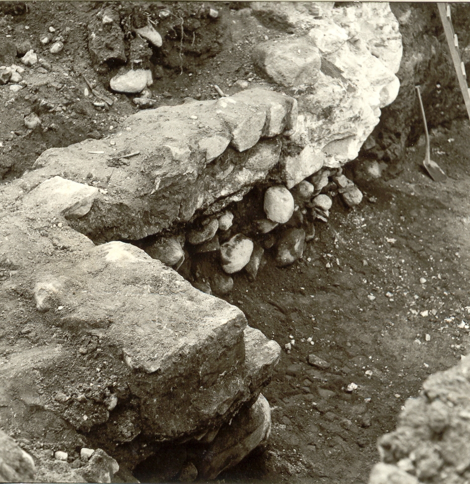 En arkeologisk undersökning på Kalmar Slott. Förborgen, sydvästra hörnet. Trappan i murhörnet, från nordöst.