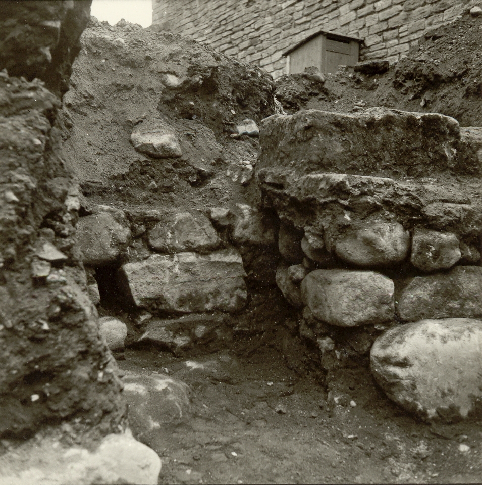En arkeologisk undersökning på Kalmar slott. Förborgen, sydvästra hörnet. Del av muren mot söder, troligen muren kring Bagaregården. Observera hålet i mellersta skiftet.