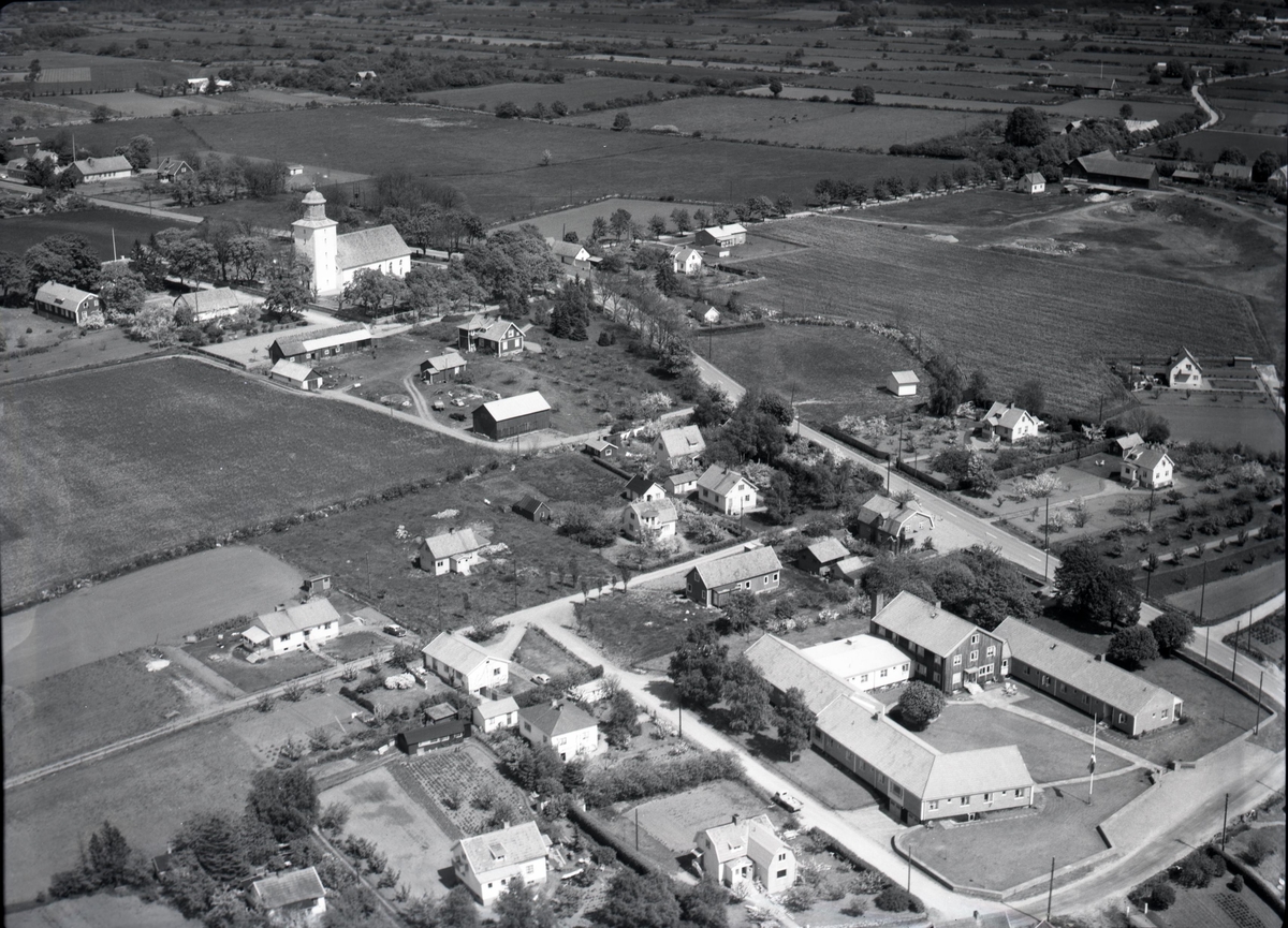 Flygfoto över Skogsby. Kyrka, skola och hus samt vägar.