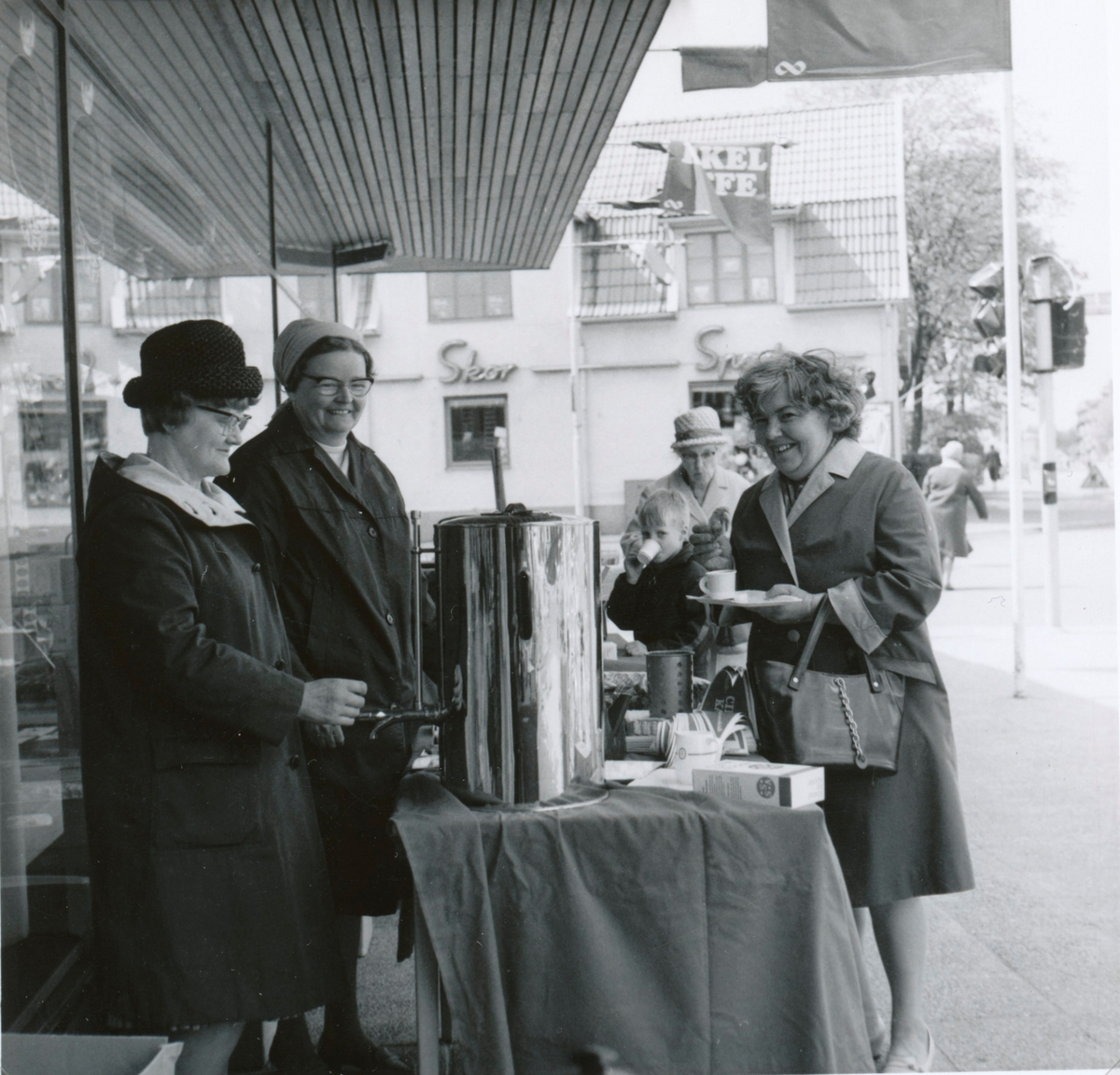 Demonstration av Cirkelkaffe utanför Domusvaruhuset i Nybro.