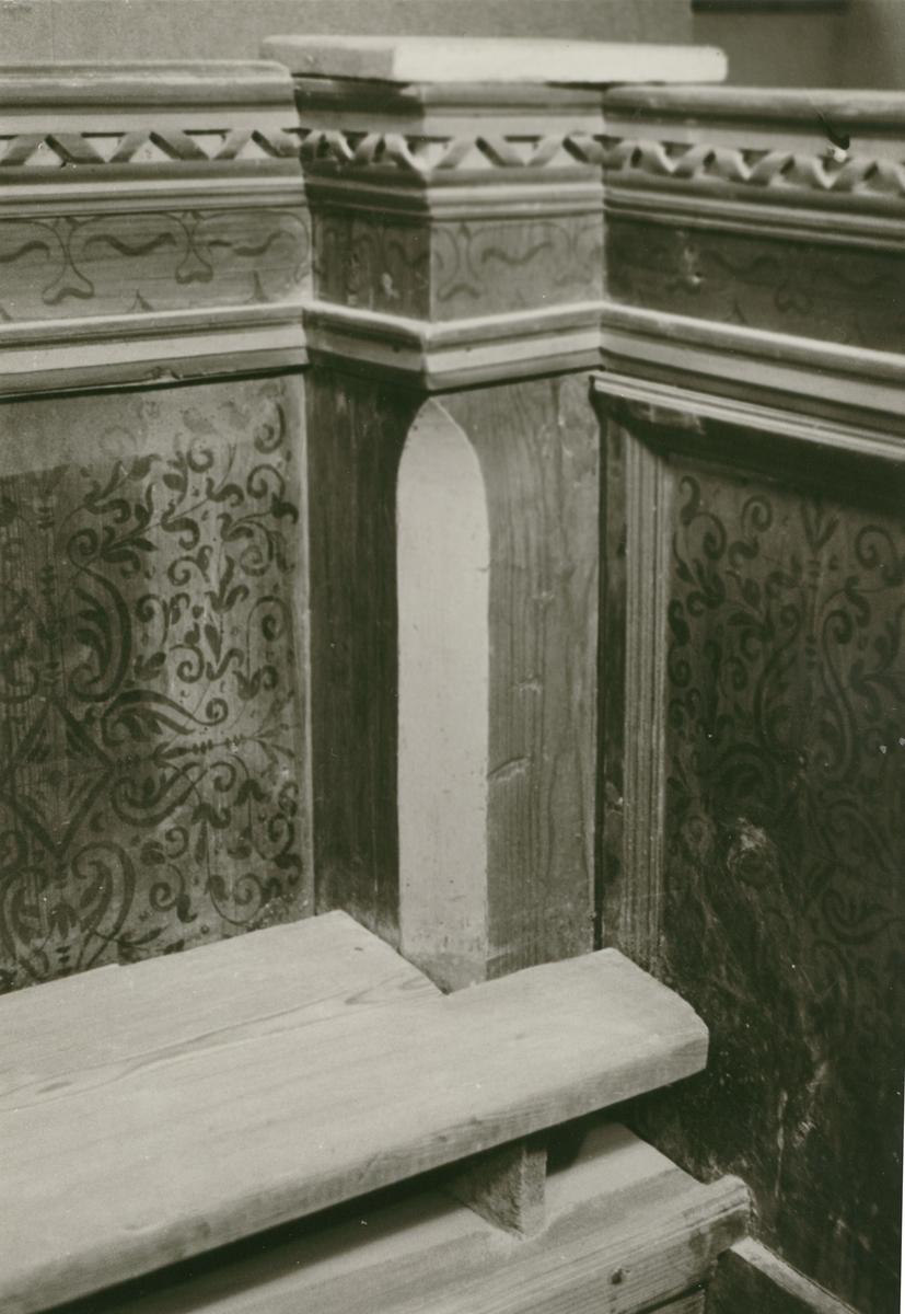 Detalj av drottningstolen i Slottskyrkan. Insidan av norra gaveln samt sydvästra hörnet.