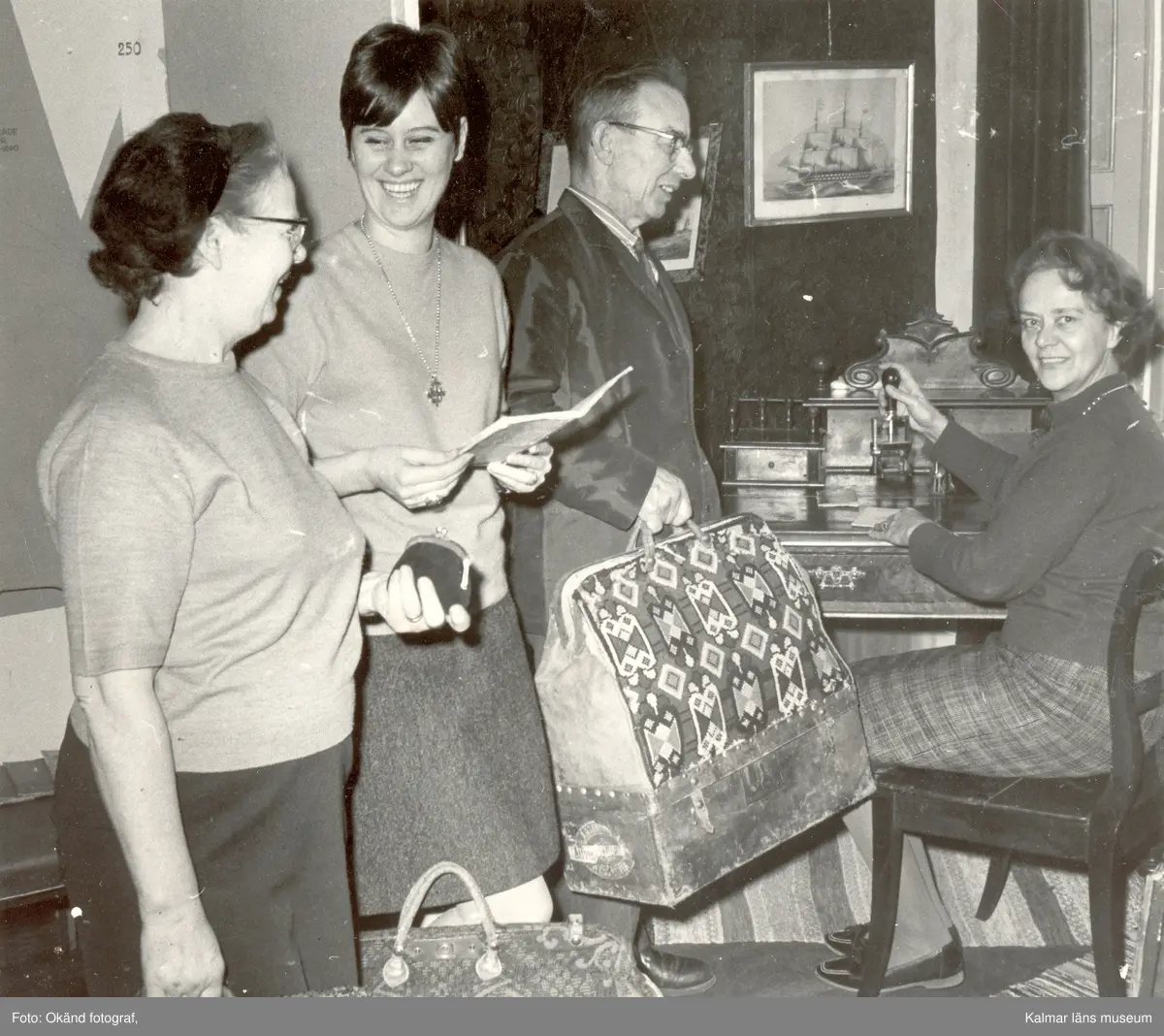 Sittande vid skrivbordet Dr. Dagmar Selling. Fr vänster Tekniskt biträde Berta Hammarberg. Antikvarie Gunnel Forsberg. Rustmästare Arthur Andersson.