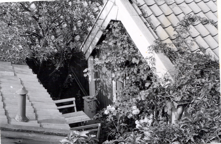 Gårdsmiljö i kv Repslagaren. Stuga med klängväxt.