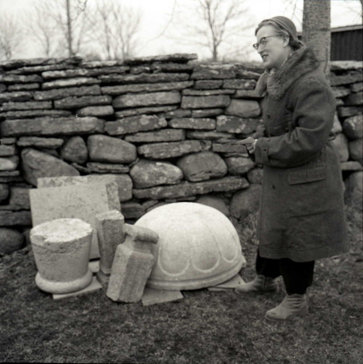 Ragnhild Boström med återfunnen dopfunt vid Persnäs kyrka.