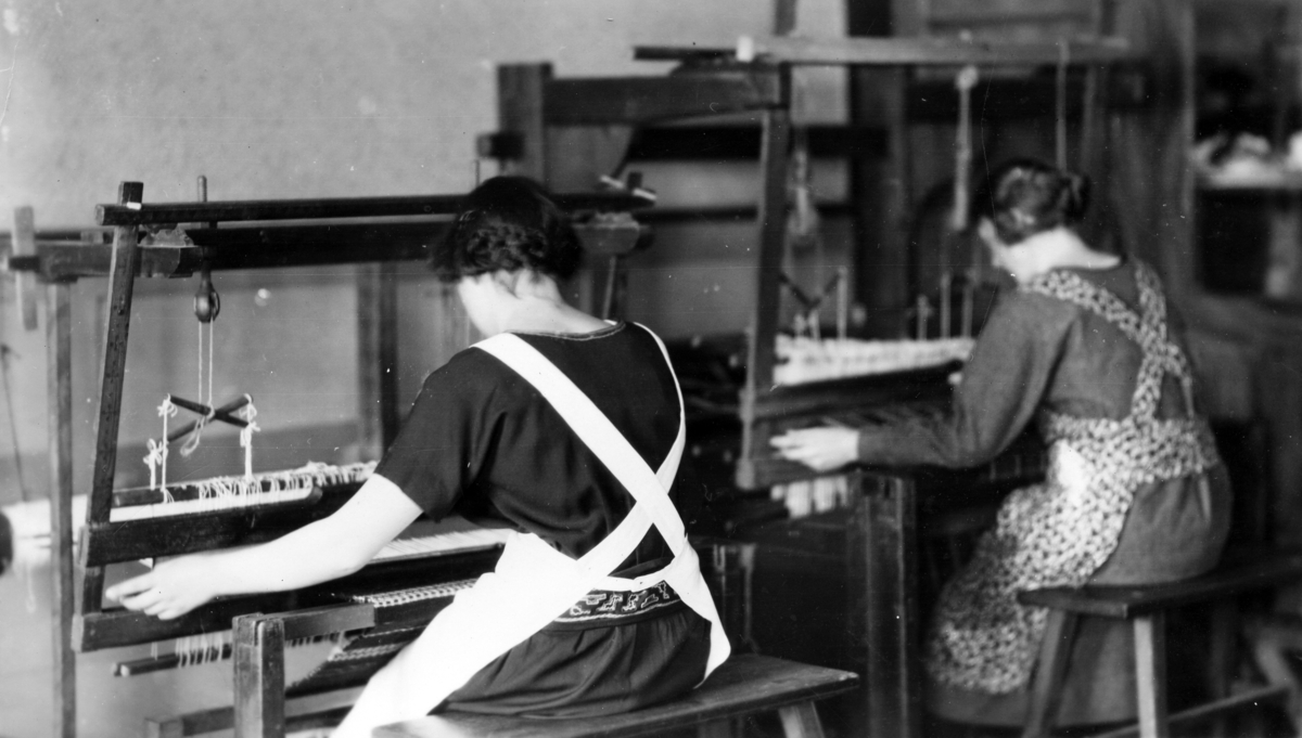 Titel: Två kvinnor vid vävstolar som väver krabbasnår i fyra skaft. Övre Hälsinglands Hemslöjdsförening. Hudiksvall.