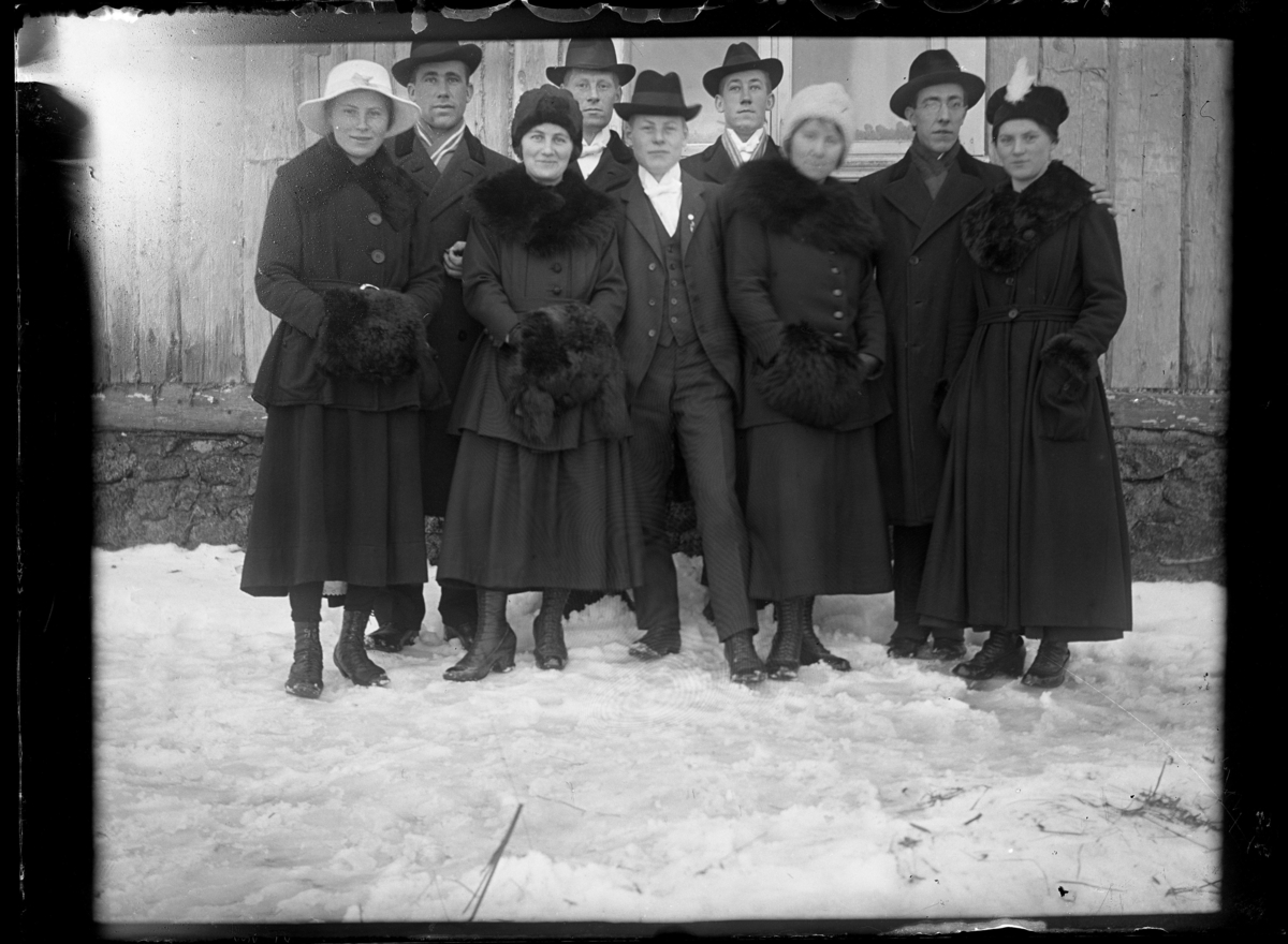 Porträtt av nio personer, män och kvinnor i vinterkläder.
