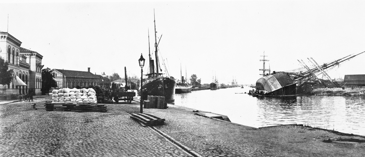Gävle inre hamn. Till höger Tullhuset, Östra Järnvägsstation och Restaurang "Fenix"