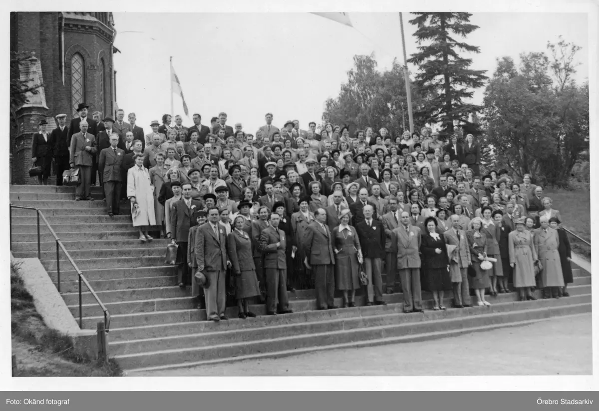 Mötesdeltagare på bibliotekariemöte framför kameran, 1940-tal