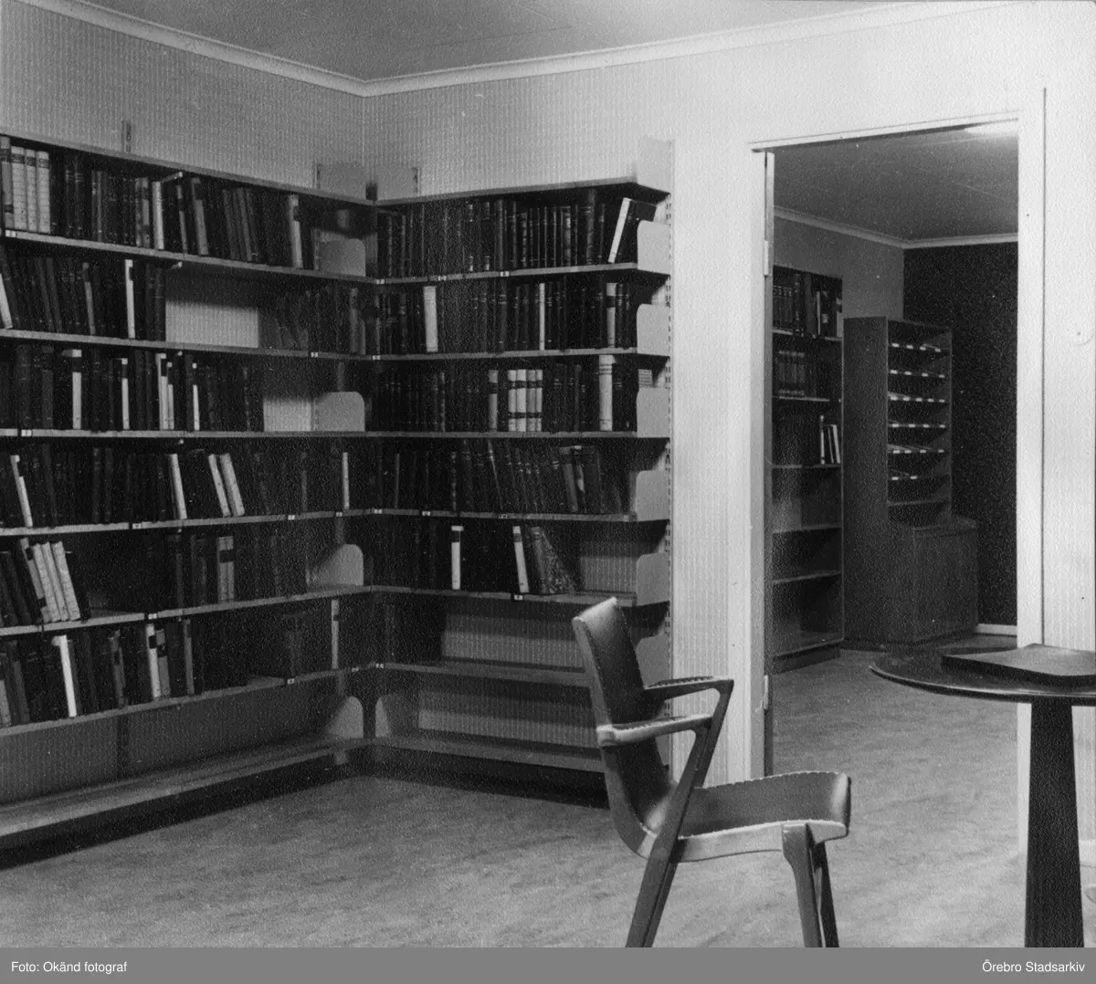 Bokhyllor och läsplats i Tysslinge Folkbibliotek i Garphyttan, 1955