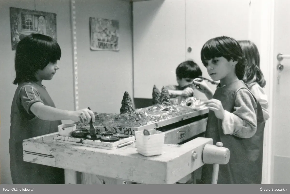 Barn bygger landskapsmodell på Almbro skola, 1984