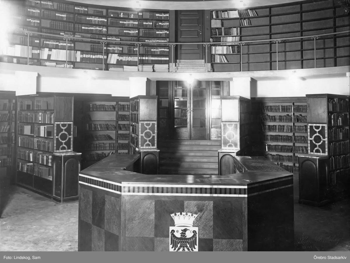 Utlåningsdisk med stadsvapen på Örebro Stadsbibliotek på Fabriksgatan, 1932