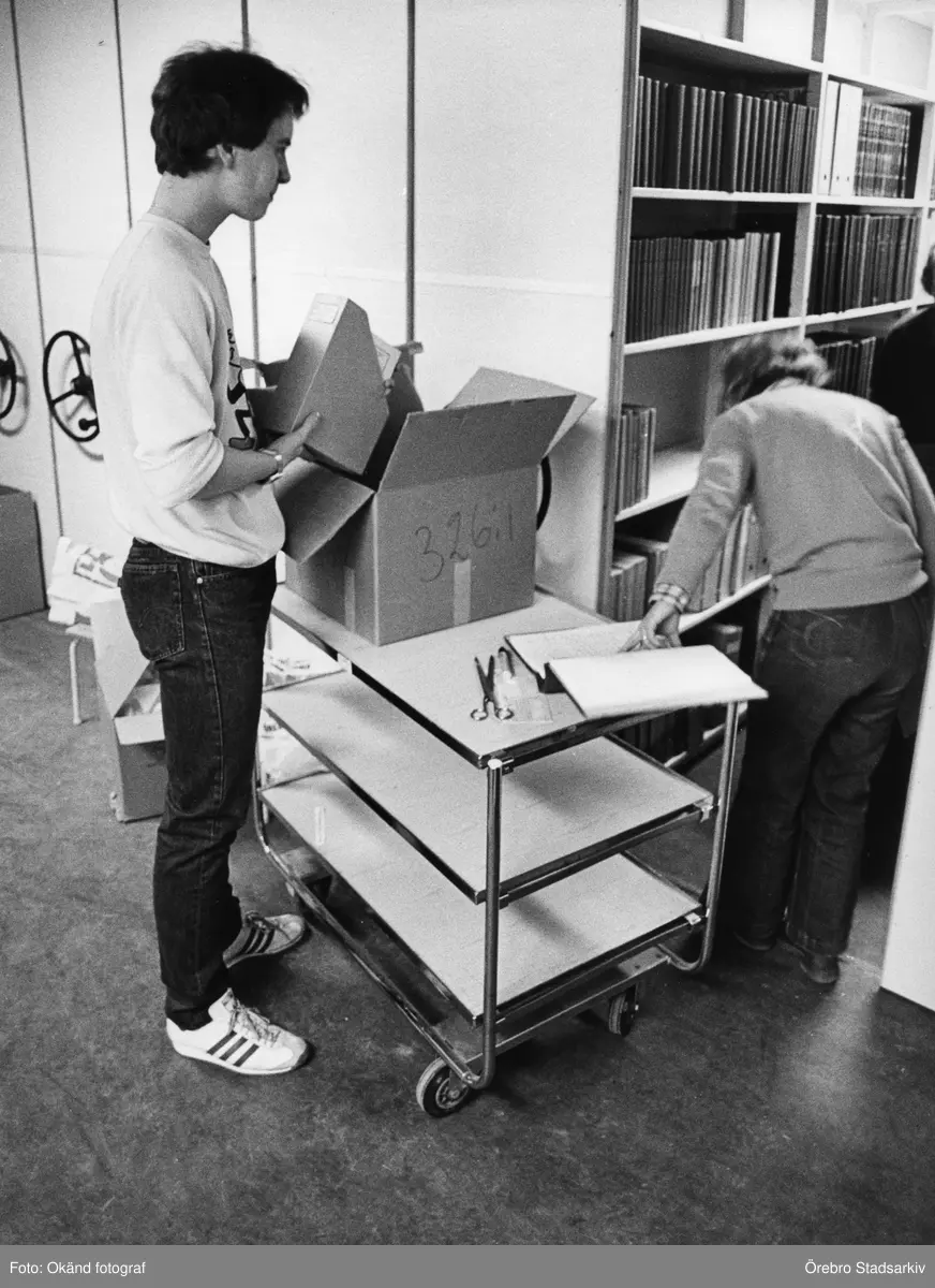 Uppackning i nya magasinet på Örebro Stadsbibliotek på Näbbtorgsgatan, 1981