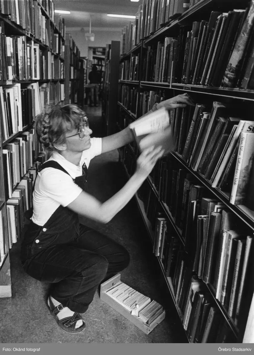 Hyllor i facksalen på Örebro Stadsbibliotek på Fabriksgatan, 1980