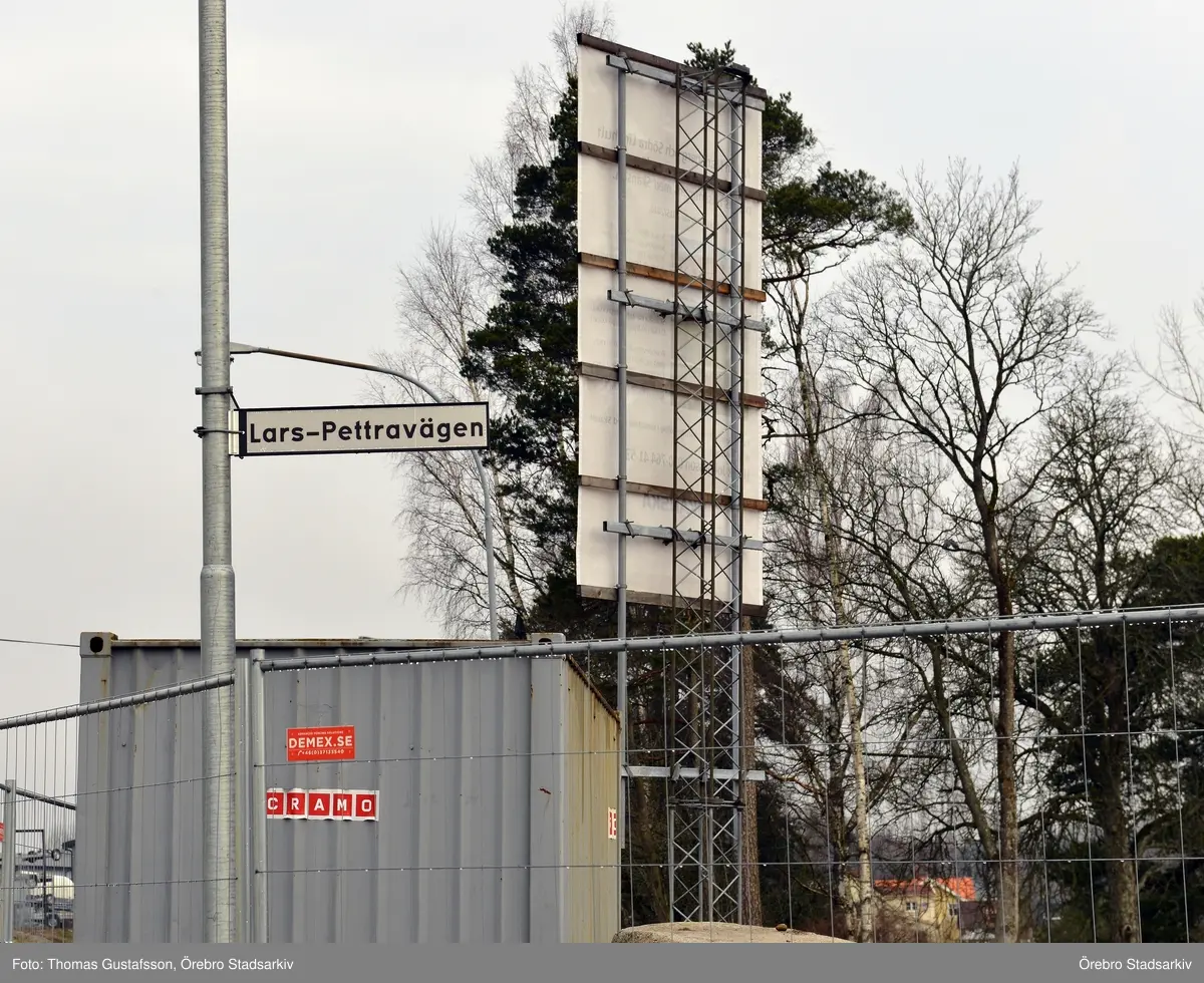 Gatuskylt och inhägnad på Lars Pettravägen, 2016-04-05