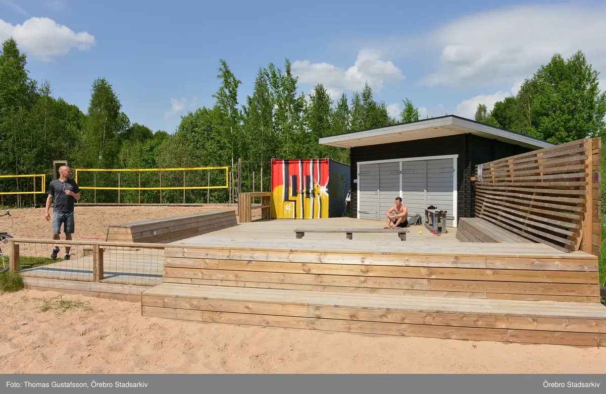 Klubbhus och trädäck vid Beachvolleyarenan, Alnängsbadet, 2016-05-24