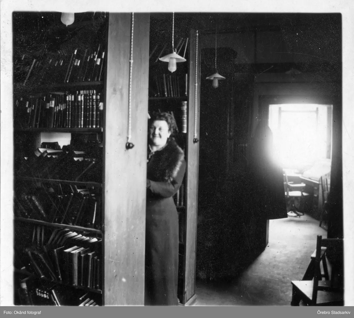 Kvinna vid bibliotekshylla på Vasagatan, 1920 ca