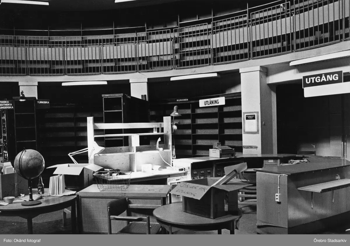 Tomma hyllor i utlångsingshallen på Örebro Stadsbibliotek på Fabriksgatan, 1981