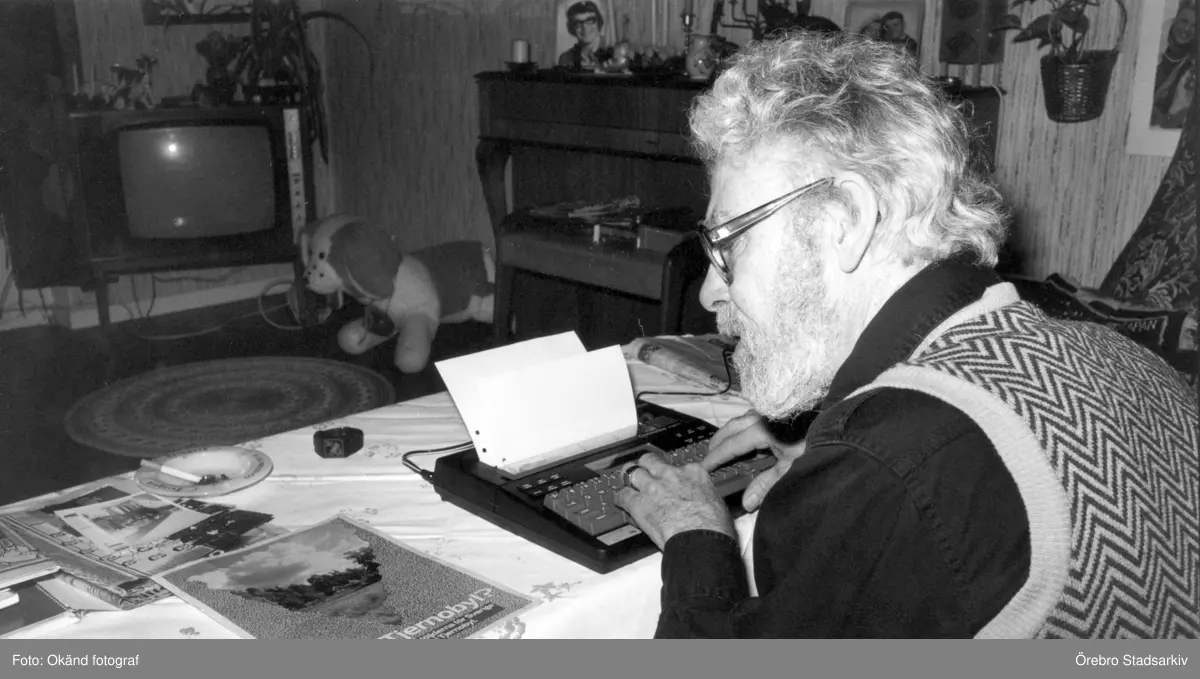 Malte Enocksson vid sin skrivmaskin, april 1987