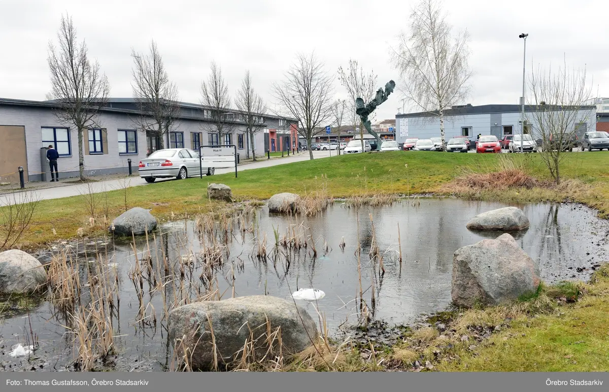 Vattendamm och konstverk vid Tullängsskolan, 2016-05-04