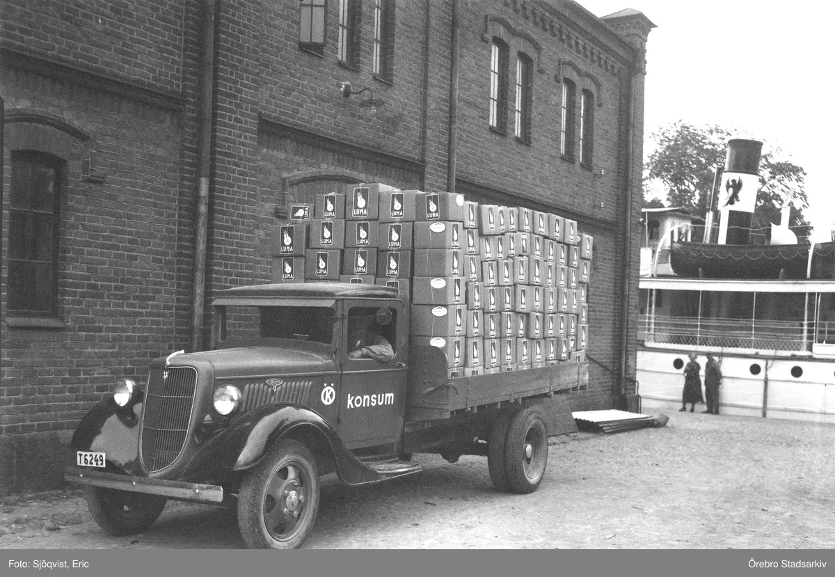 Lastbil lastad med glödlampor vid hamnen, 1940-tal