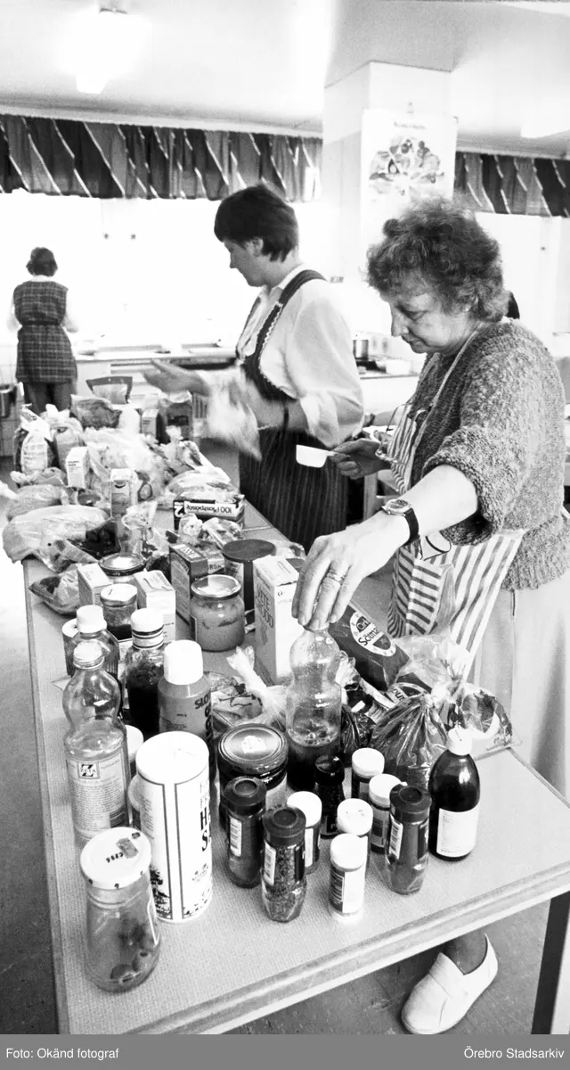 Kvinnor vid bord med råvaror, 1988